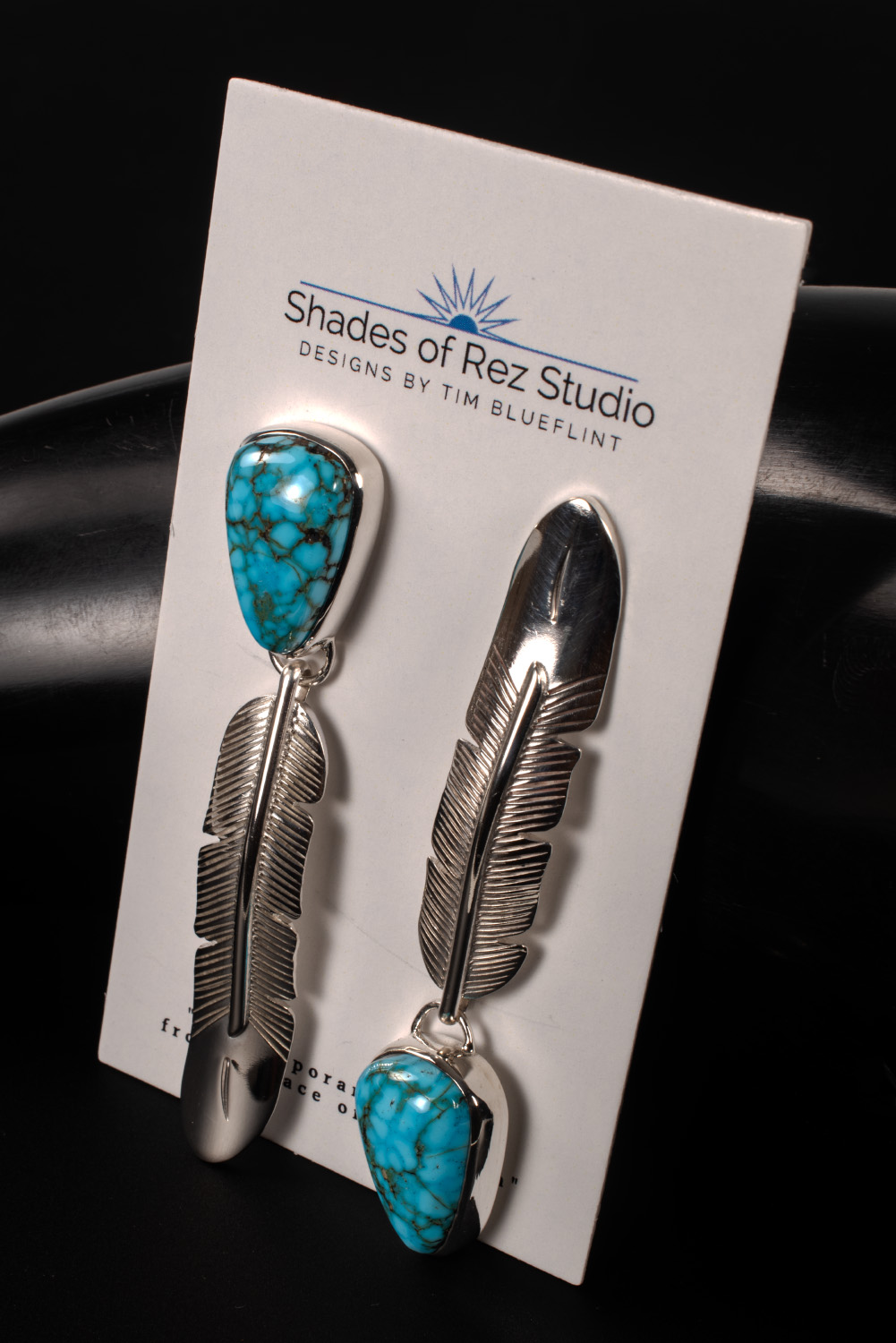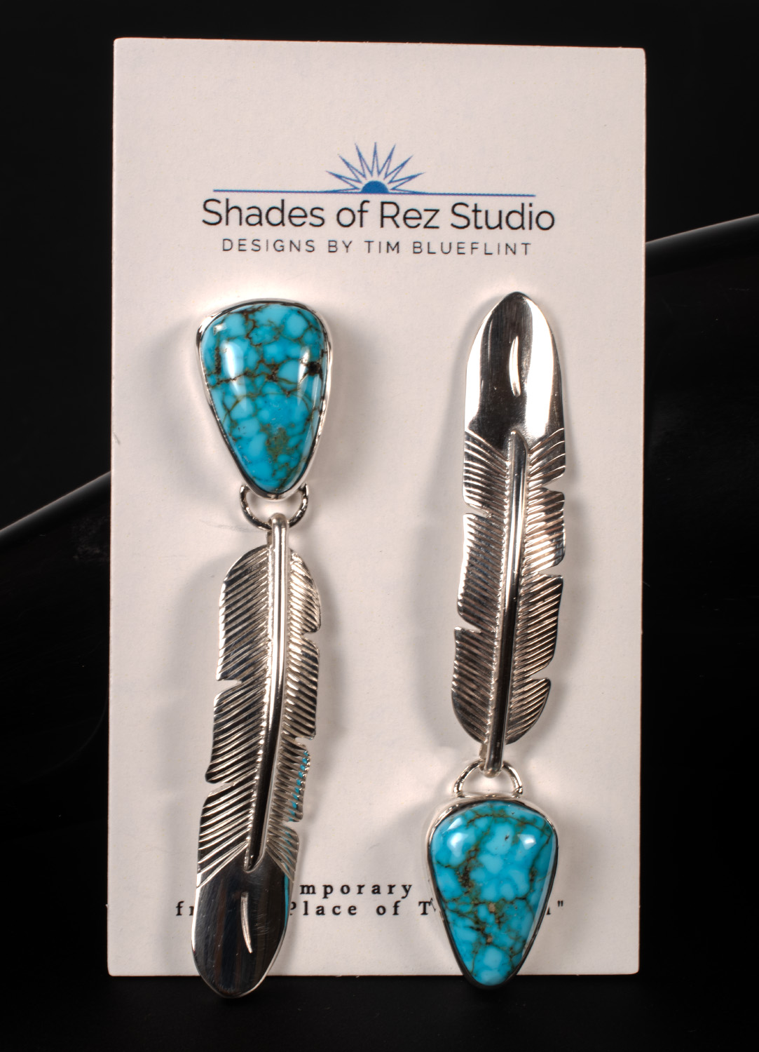 Fabricated (not cast), engraved and formed Sterling Silver eagle feather asymmetric earrings set with Artisan cut, natural Kingman Black Web Turquoise.