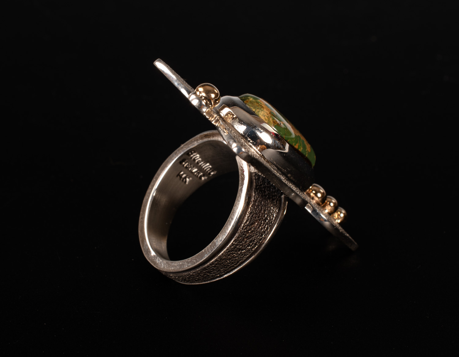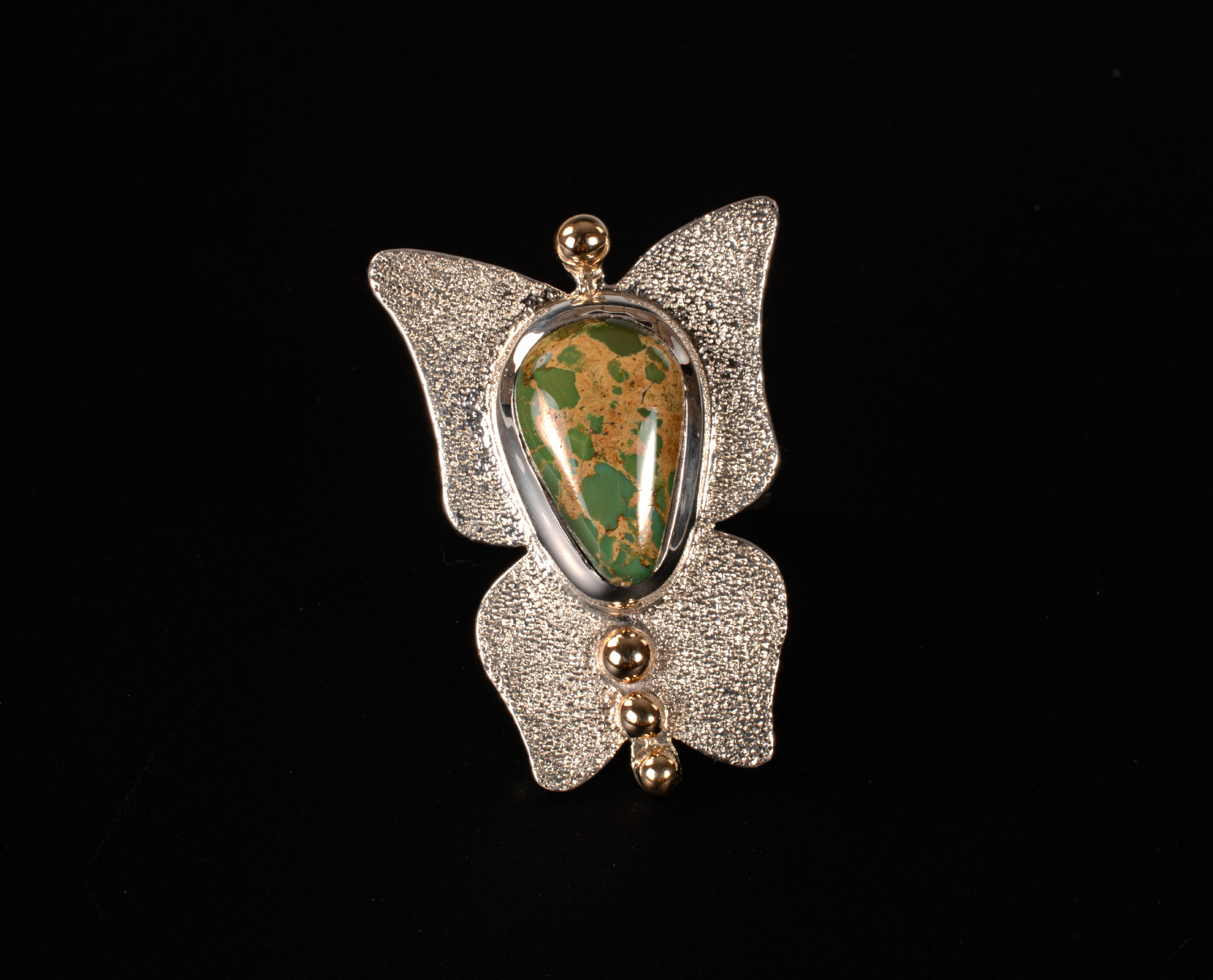 Fabricated (not cast), chiseled, textured and formed Sterling Silver Butterfly ring with natural Royston Turquoise and 14k Gold accents. Heavy ring band is tapered for comfort.